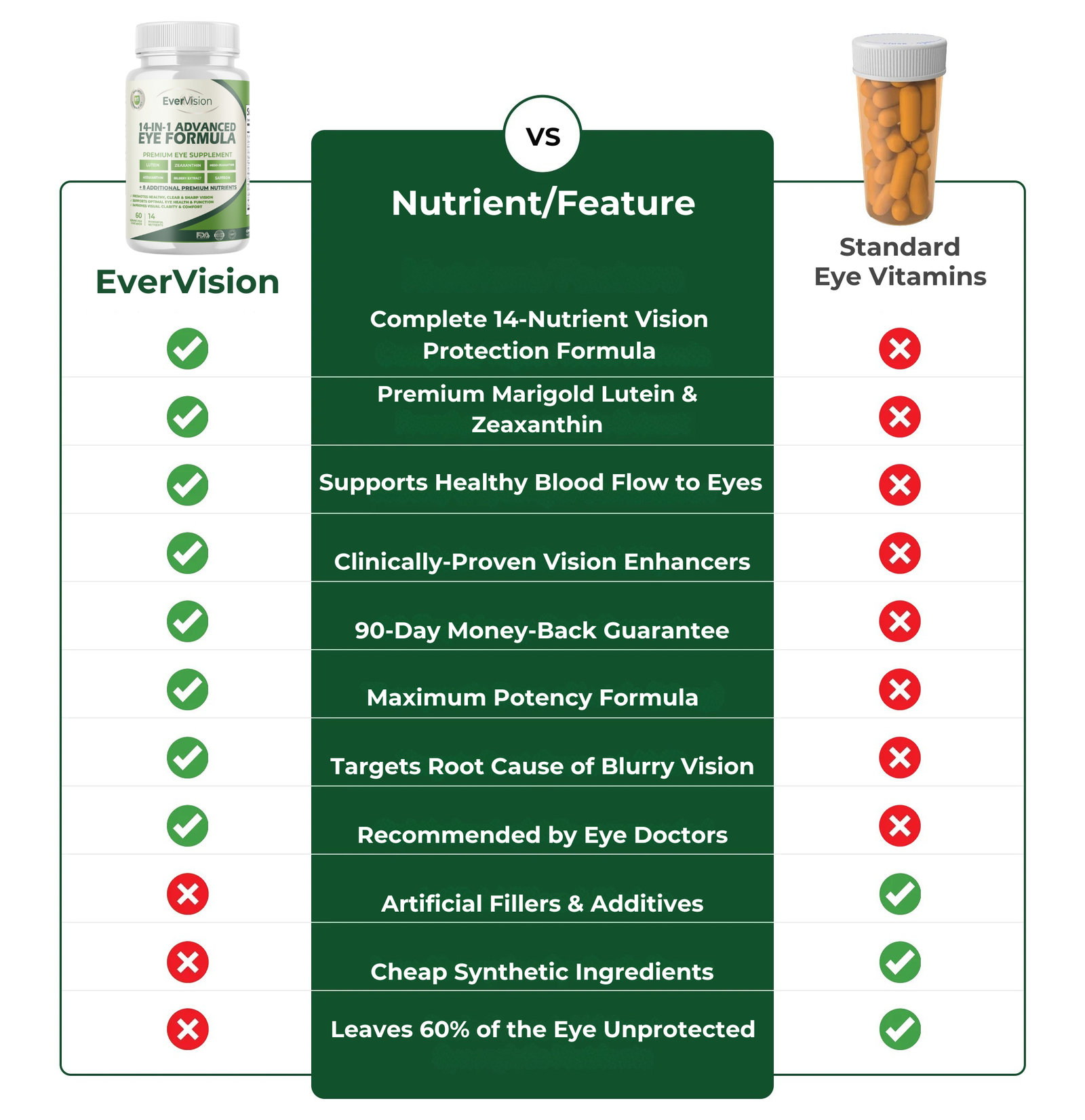 Complete protection. Most eye supplements only protect 60% of your vision. EverVision includes all 3 critical carotenoids (Lutein, Zeaxanthin, AND Meso-Zeaxanthin) plus 11 other essential nutrients at clinical-strength doses. We also include Harvard-proven vision enhancers like Saffron Extract that most brands skip. It's the difference between an incomplete formula and one that actually works.